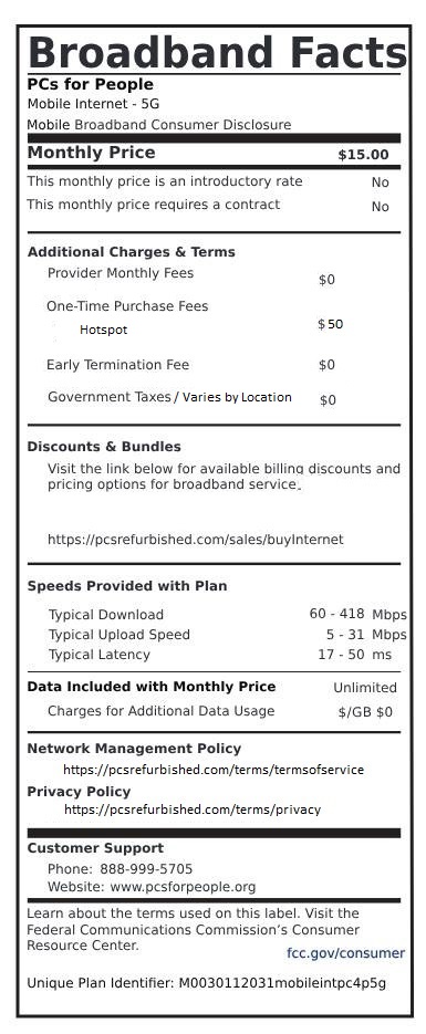 Yes. Through Mobile Beacon, PCs for People’s users will be able To use an unlimited 4G or 5G LTE data-only plan with no data caps or throttling. The data plan is subject to a network management policy.*
