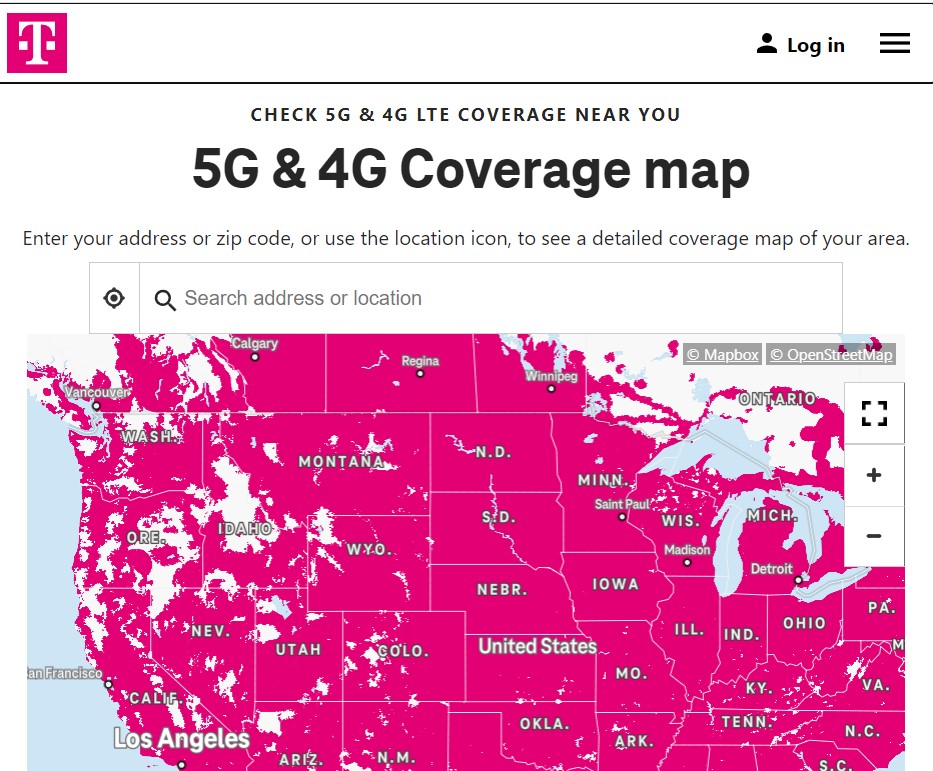 2. Ensure the page says You'll have access to 5G and/or 4G LTE coverage here. as shown in Section C to the left. To see only 4G coverage, disable 5G by clicking the toggle button on the map in the upper left hand corner.